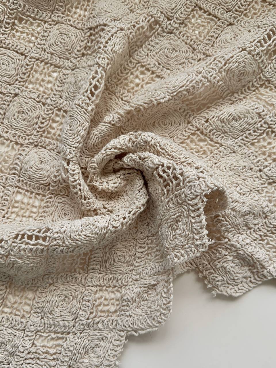 ХАРАКТЕРИСТИКИ: Хлопковое кружево кроше натурального оттенка Рисунок в виде ромбов, обе кромки фигурные и не требуют обработки Мягкое, тактильно приятное Тянется за счет вязки ЧТО ШЬЁМ: Эта ткань – самый горячий тренд Из нее можно шить юбки, платья, брюки, лонги Так как ткань тянется, можно шить изделия по фигуре УХОД ЗА ИЗДЕЛИЕМ: • стираем на 30-40 градусах с жидким моющим средством • можно не утюжить • перед пошивом необходимо провести декатировку, замочив в теплой воде 30-40 градусов
