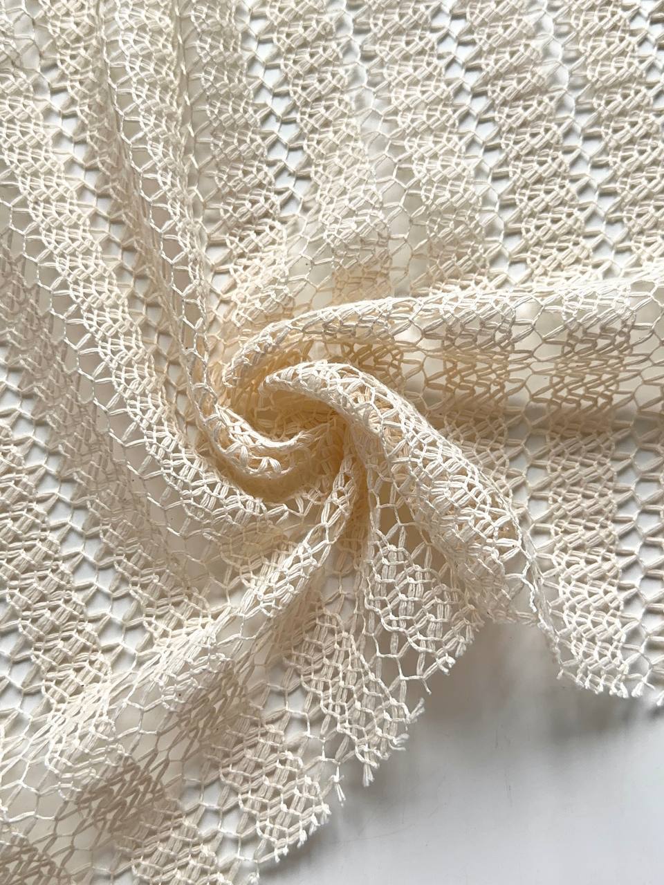 ХАРАКТЕРИСТИКИ: Хлопковое кружево кроше Рисунок в виде полос расположен вдоль полотна Полотно мягкое, приятное в руках, имеет кремовый натуральный оттенок хлопка Тянется за счет переплетения нитей больше по утку, чем по долевой ЧТО ШЬЁМ: Эта ткань – самый горячий тренд летнего сезона Из нее можно шить юбки, платья, брюки, лонги Так как ткань тянется, можно шить изделия по фигуре УХОД ЗА ИЗДЕЛИЕМ: • стираем на 30-40 градусах с жидким моющим средством • можно не утюжить