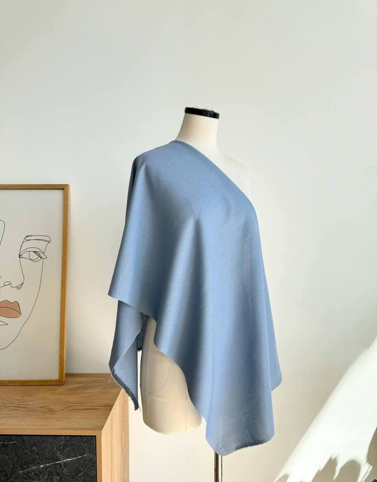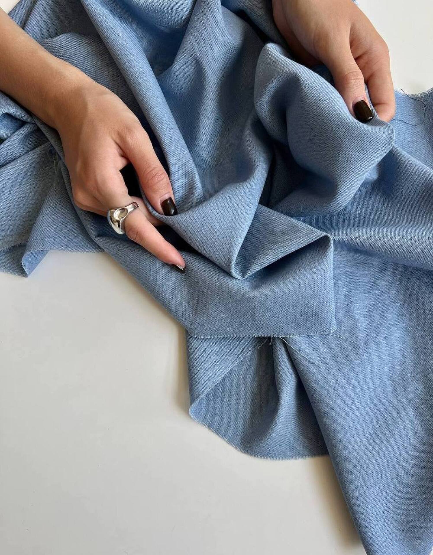 Эта ткань достаточно мягкая, пластичная, тянется, так как в составе присутствует эластан Мнется, но хорошо разглаживается Для светлых оттенков может потребоваться подкладочная ткань на подол Можно использовать хлопковый батист Не колется, но у всех разный порог чувствительности, учитывайте это Может отдавать небольшие волокна вискозы в процессе, это не является дефектом Также для льна допустимо наличие утолщений нитей, неоднородность переплетения Лен с вискозой - идеальная ткань для изделий на лето или для жаркого климата Благодаря натуральному составу, в изделии из этого льна будет комфортно как летом в жару, так и в прохладное время ЧТО ШЬЕМ Подойдет на любое летнее изделие Платья, юбки, сарафаны, шорты, брюки, туники, рубашки, топы, костюмы Изделия будут легкие, воздушные. Форму держать не будут, если не дублировать. Выбирайте модели свободного кроя с достаточной свободой облегания ДЕКАТИРОВКА • Замачиваем ткань в теплой воде 30 градусов (для стабилизации цвета можно добавить 1 столовую ложку уксуса на литр воды) отжимаем, но не выкручиваем • Сушим на горизонтальной поверхности, не на веревке и без прищепок. Не допускаем полного высыхания полотна • Утюжим слегка влажным с изнанки по долевой на режиме лен Правильно проведенная декатировка стабилизирует нити ткани (восстанавливает их первоначальное положение), также происходит усадка ткани УХОД ЗА ИЗДЕЛИЕМ • Стираем на деликатном режиме, при температуре 30 градусов или ручная стирка. Используем жидкое средство для цветных вещей. Отжим до 800 оборотов или выжимаем руками (не выкручиваем) • Встряхиваем изделие и сушим желательно в горизонтальном положении. Если сушим вертикально, то не используем прищепки • Не допуская полного высыхания изделия, утюжим его в режиме лен