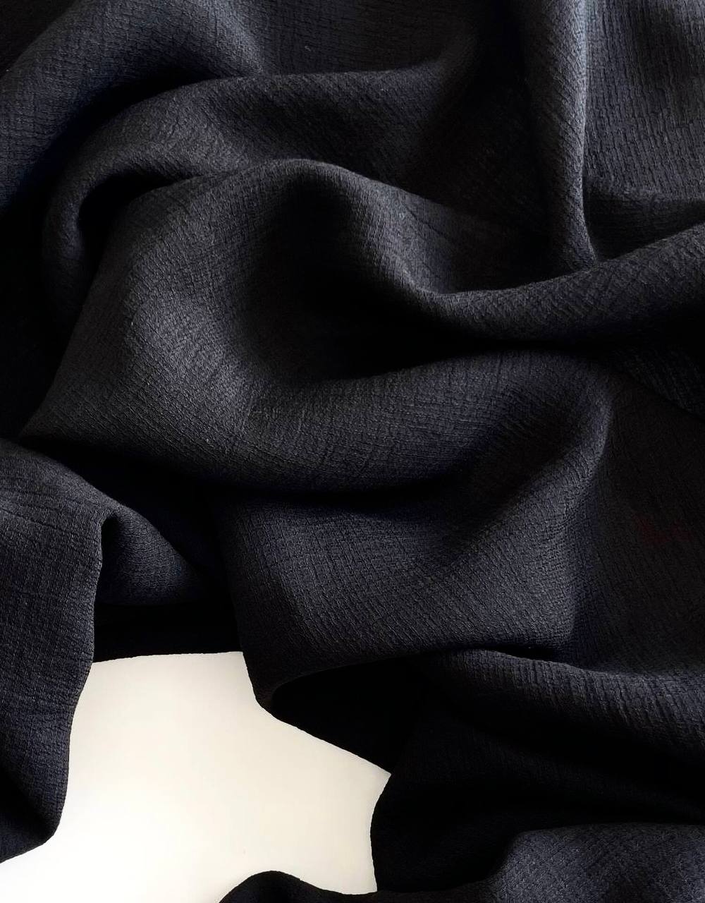 ХАРАКТЕРИСТИКИ: Красивая фактурная вискоза глубокого черного цвета За счет фактуры ткани создает в изделиях красивый эффект Просвечивает, слегка мнется ЧТО ШЬЁМ: Вискоза подойдет для пошива блуз, рубашек, юбок, платьев, сарафанов для взрослых и детей Выбирайте модели свободного кроя (ткань не тянется, в составе нет эластана) За счет того, что вискоза красиво драпируется, изделия получается летящим, воздушным, с мягкими ниспадающими складками Для пошива используем универсальные нитки Madeira 400м ДЕКАТИРОВКА ВИСКОЗЫ: Перед пошивом необходимо провести декатировку ткани Для этого замочите ткань в теплой воде 30-40 градусов Далее слегка отожмите (не выкручивайте со всей силы) и разложите на горизонтальной поверхности (в идеале) или на перекладине Не используйте прищепки Слегка влажную ткань утюжим на режиме вискоза с изнаночной стороны по долевой Даем отлежаться, остыть и переходим к крою КАК УХАЖИВАЕМ: • Стираем на 30-40 градусах с добавлением жидкого моющего средства. Не используем агрессивные порошки, отбеливатель Можно добавлять кондиционер для большей мягкости Отжим не больше 800 оборотов • Сушим, предварительно встряхнув, в расправленном виде вдали от отопительных приборов или яркого солнца • Утюжим в режиме вискоза слегка влажное изделие