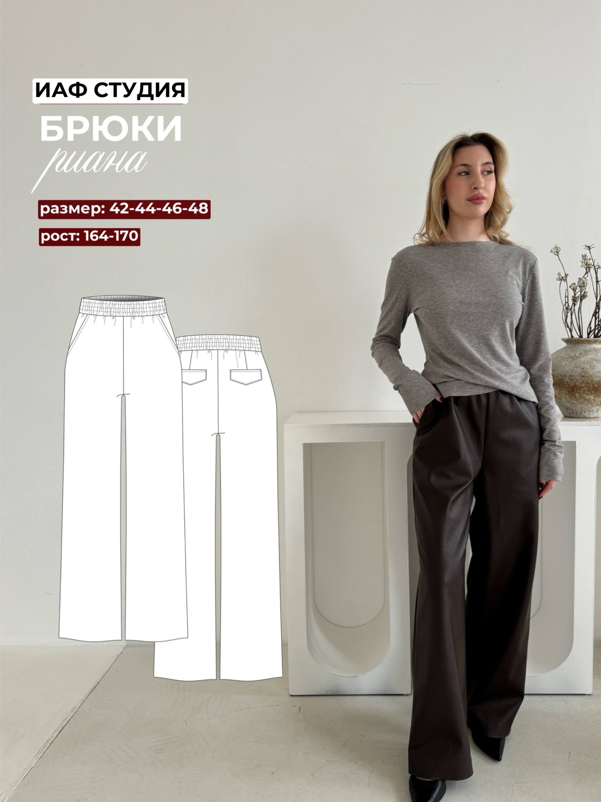 Брюки женские прямого силуэта, свободного объема со средним уровнем посадки. На передних половинках брюк обработаны карманы в подрезном бочке. Отделочная строчка по входу в карман 0.5 см На задних половинках брюк две вытачки и два декоративных фигурных клапана. Отделочная строчка по вытачкам 0.1 см. Отделочные строчки по срезам клапана 0.1 см, по линии притачивания клапана отделочная строчка на 0.5 см. Верхний срез брюк обработан широким притачным поясом не резинке. По поясу три параллельные отделочные строчки шириной 1 см. Низ брюк фиксируется на клеевую паутинку без последующего застрачивания. Изделие на фото выполнено из экокожи оттенке горький шоколад Модель Мила : Рост 165, ОГ 86, ОТ 64, ОБ 96, выбранный размер 42-44