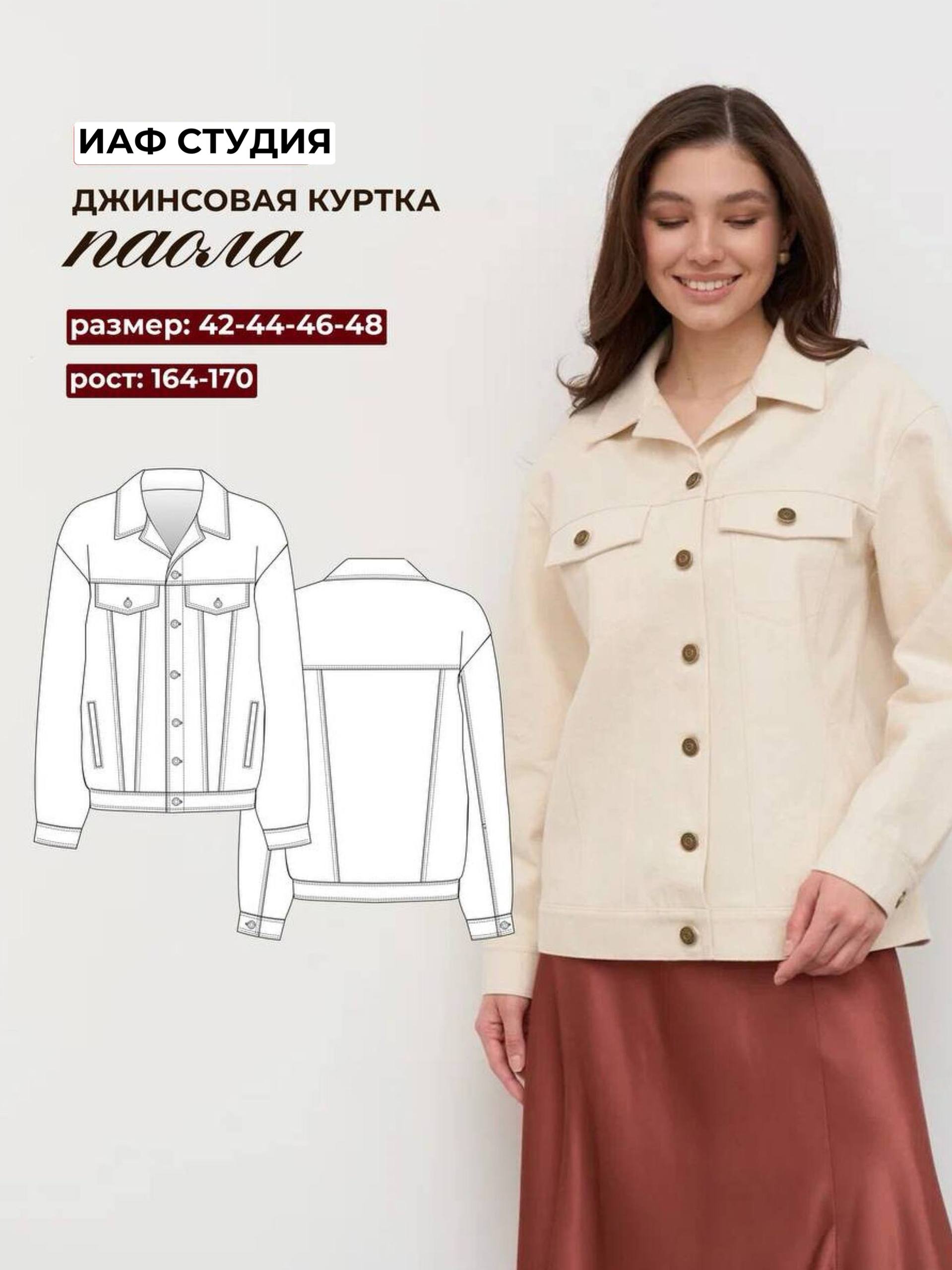 Куртка умеренного объема, прямого силуэта средней длины. Полочка с рельефными швами и кокеткой. На полочках расположены нагрудные карманы в шве с клапаном и боковые карманы с листочкой. Двойные отделочные строчки по рельефам, кокетке, клапанам. Отделочная строчка на 0,1 см вкруговую вдоль листочек. карманы застегиваются на прорезные петли и джинсовые пуговицы. Так же на полочках отделочная строчка по форме мешковина кармана. Спинка с рельефными швами и кокеткой. Двойные отделочные строчки по рельефам и кокетке. Воротник рубашечного типа отложной с лацканами. По отлетам воротника двойные отделочные строчки. Застежка на широкую притачную планку с джинсовыми пуговицами и прорезными петлями. Линия плеча немного спущена. Рукав двухшовный, длинный, рубашечного кроя, по локтевому шву расположен разрез. Низ рукава обработан притачной манжетой, застегивающейся на петлю и пуговицу. двойные отделочные строчки по локтевому шву, проймам и манжетам вкруговую. Низ изделия так же обработан притачной манжетой с отделочными строчками на 0,1 в круговую.