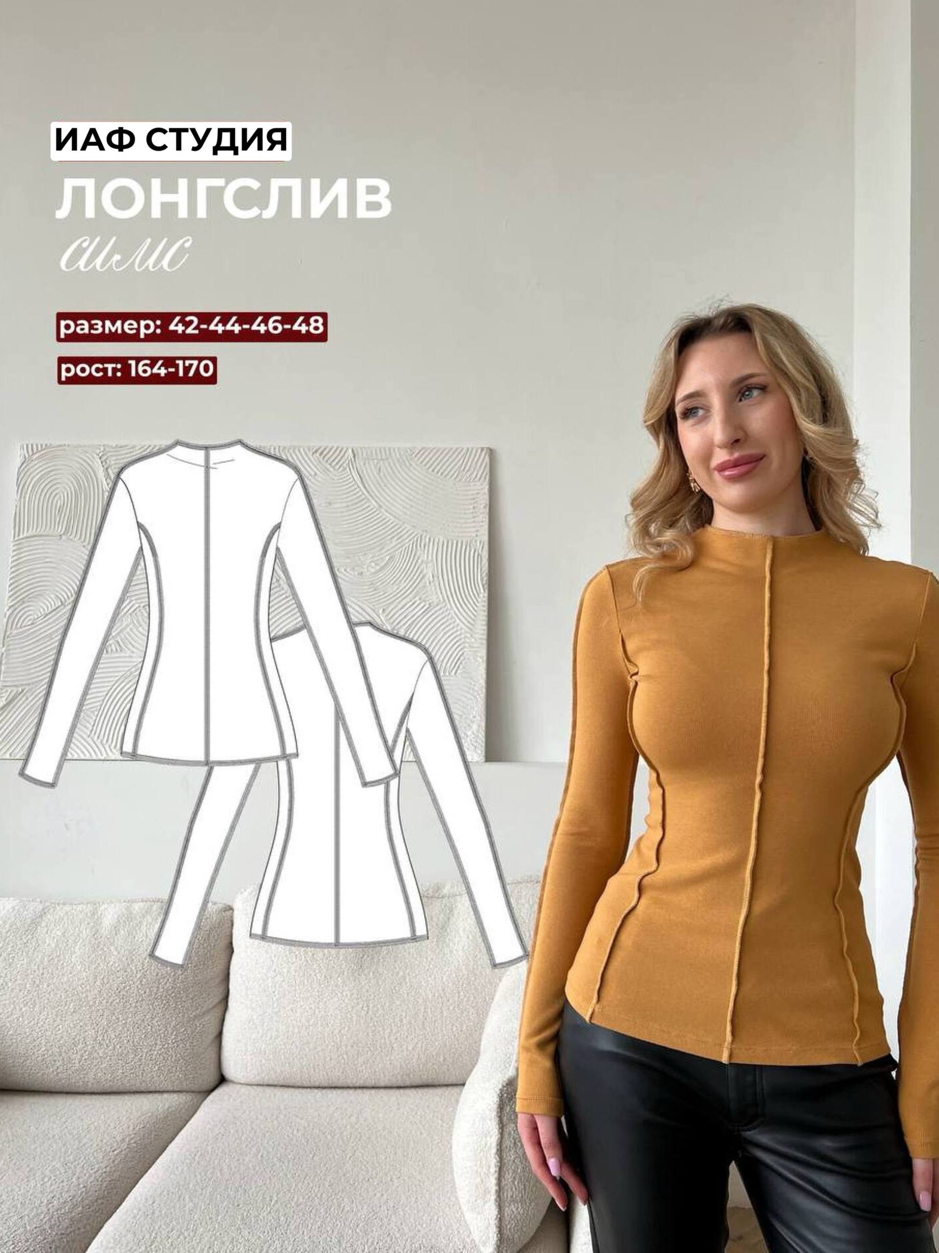 Лонгслив облегающего силуэта, стандартной длины. Полочка и спинка со средним швом и рельефами. Бочки цельнокроеные без боковых швов. горловина стойка обработана обтачкой. Рукава втачные двушовные, малообъемные, слегка удлиненные (до косточки). Срезы рельефов, средних швов, плечевые срезы,срезы рукавов обработаны швами наружу. срез горловины обработан оверлоком. Линии проймы обработаны стандартно. Низ рукавов и низ изделия обработан швом в подгибку с отстрочкой. Модель Мила : Рост - 165 ОГ - 86 ОТ - 64 ОБ - 96 выбранный размер 42, рост 164
