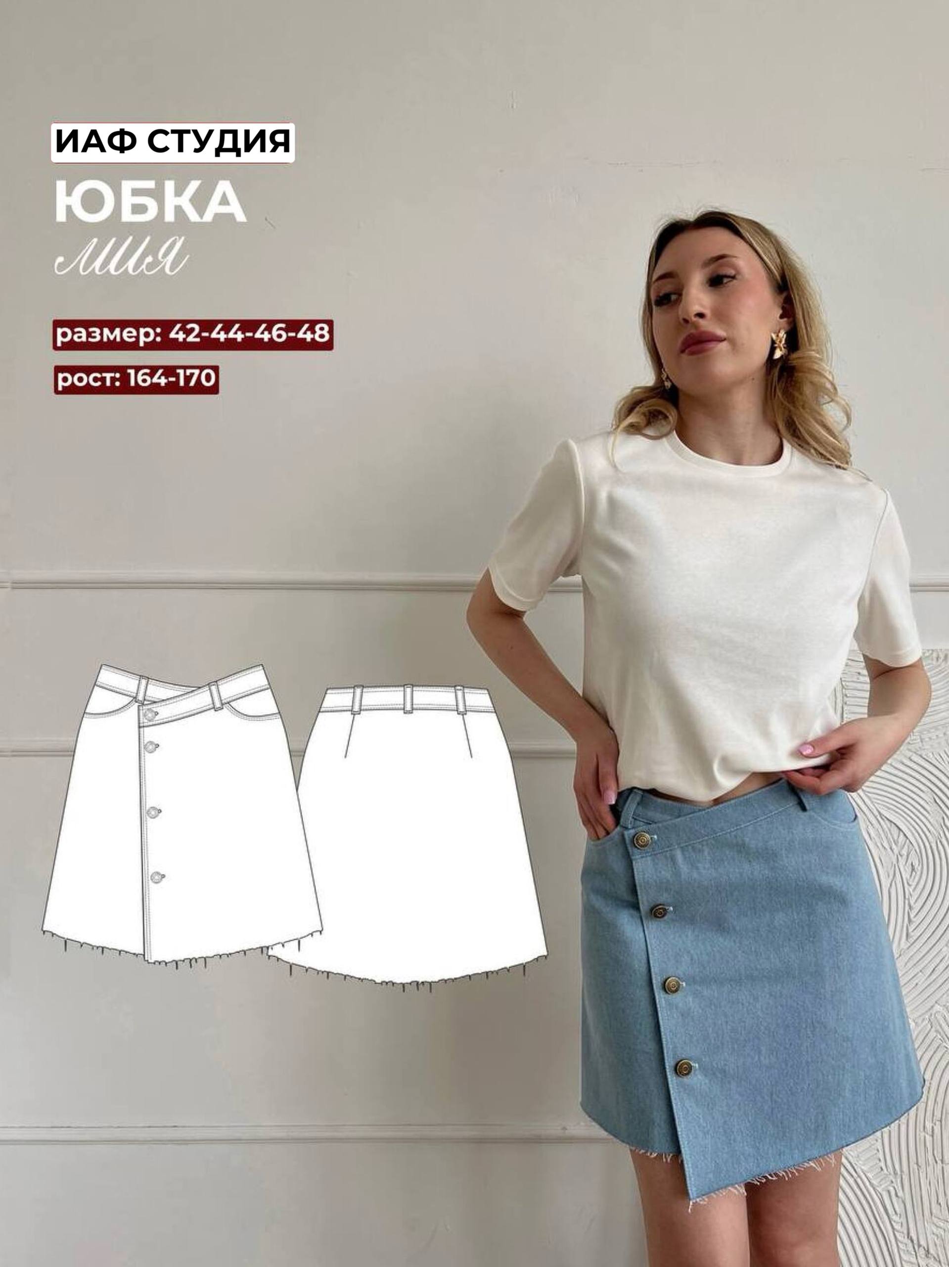 Юбка трапециевидного силуэта, асимметричного кроя, с завышенной линией талии. Переднее полотнище имеет застежку на «запах», фигурные карманы в подрезном бочке. застежка на пробивные петли и джинсовые пуговицы. Двойные отделочные строчки по входу в карманы и по срезам полотнищ на 0,1 и 0,5 см. Заднее полотнище с двумя вытачками. Юбка с притачным поясом и 5 шлевками. Двойные отделочные строчки вкруговую по поясу и шлевкам. Нижний срез юбки не обрабатывается. Модель Мила : Рост - 165 ОГ - 86 ОТ - 64 ОБ - 96 выбранный размер 42, рост 164